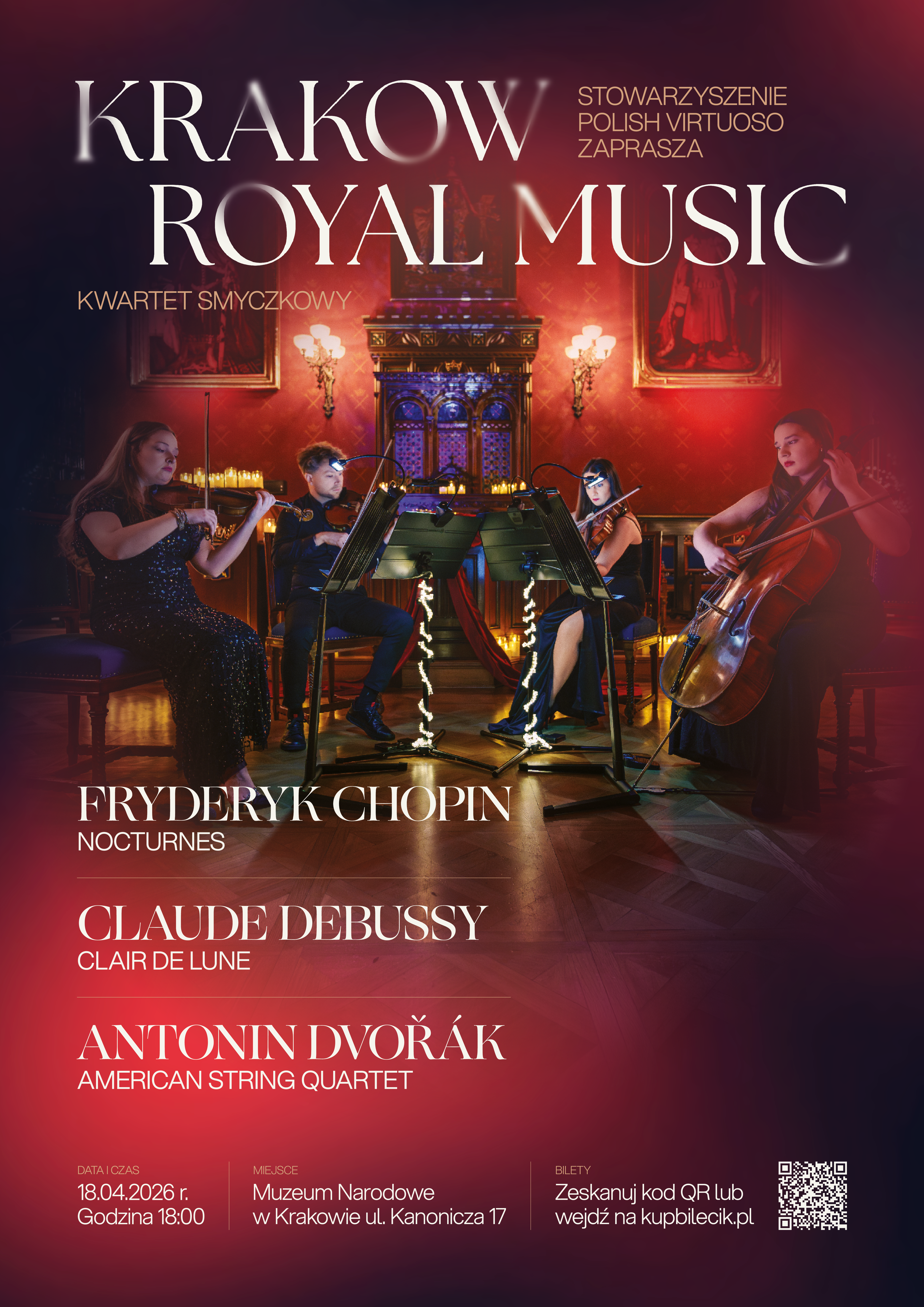 Krakow Royal Music wraz ze Stowarzyszeniem Polish Virtuoso zaprasza na serię koncertów kameralnych, gdzie muzyka łączy się z piękną architekturą wnętrz w klimatycznym, nastrojowym blasku świateł. Łączymy klasykę z nowoczesnością. Nasze koncerty to doskonaly wybór dla widzów w każdym wieku, artyści mają znakomity kontakt z publicznością, programy składają się ze specjalnie wyselekcjonowanego repertuaru, w wyjątkowych aranżacjach! Nadchodzący program to Chopin/Debussy/Dvořák, wiosenne impresje smyczkowe w Muzeum Narodowym.